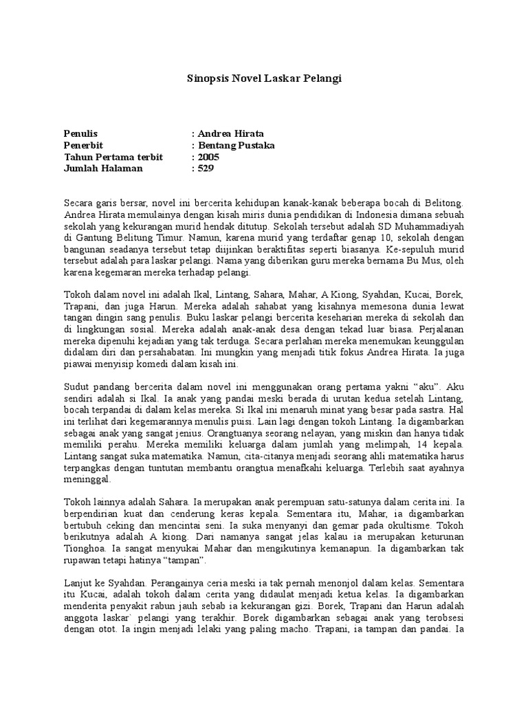 Novel ini bercerita tentang kehidupan 10 anak dari keluarga miskin yang bersekolah (sd dan smp) di sebuah sekolah muhammadiyah di pulau belitong yang penuh dengan keterbatasan. Berawal dari sebuah sekolah yang terancam ditutup oleh kemindikbud, karna tidak tercapainya minimal jumlah murid yang seharusnya. Resensi laskar pelangi adalah novel karya andrea hirata yang diterbitkan oleh bentang pustaka pada tahun 2005. Resensi laskar pelangi adalah novel pertama karya andrea hirata yang diterbitkan oleh bentang pustaka pada tahun 2005. Resensi novel my possessive ketos.