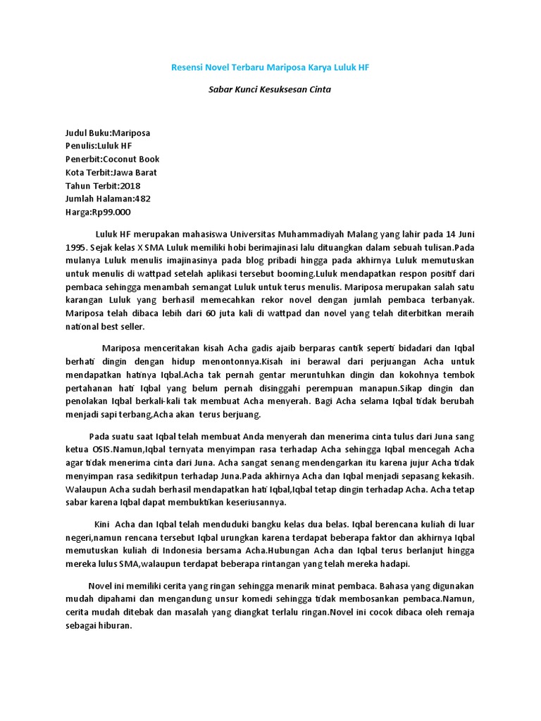Dalam kbbi, resensi adalah ulasan dari sebuah buku. Karena hanya di bursa buku berkualitas kalian akan mendapatkan hargayang sangat murah untuk novel. 2007 (cetakan ketiga) tebal halaman : Buku ini menceritakan seseorang bernama dimas yang ingin menjadi ketua himpunan periode baru, namun ia masih ragu untuk menentukan siapa yang akan menjadi wakilnya. Resensi laskar pelangi adalah novel pertama karya andrea hirata yang diterbitkan oleh bentang pustaka pada tahun 2005.